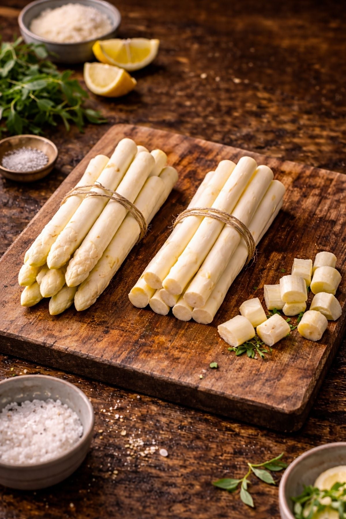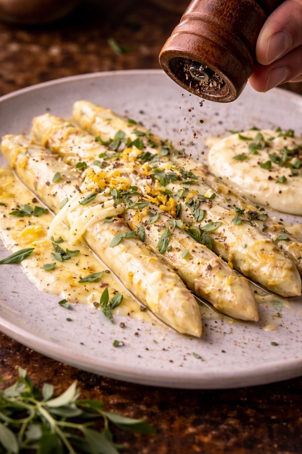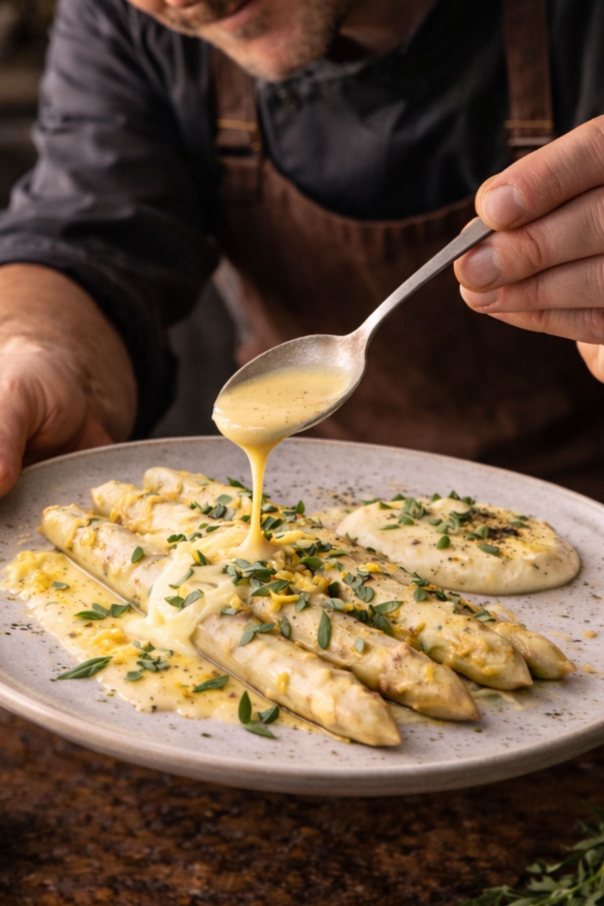 Der Spargelsud: Dieser Sud ist dein Fundament. Nimm dir Zeit dafür. Setze Wasser in einem breiten Topf auf und würze es mit Salz, Würfelzucker und 1 EL Butter. Lege die Spargelabschnitte hinein und lasse alles 20 Minuten ziehen. Kein sprudelndes Kochen – du willst Aromen lösen, nicht zerreißen. Entferne die Abschnitte und lege die gebündelten Spargelstangen vorsichtig ein. Die Spitzen müssen vollständig bedeckt sein, damit sie gleichmäßig garen. Jetzt kurz vorausdenken: Schöpfe 100 ml heißen Sud ab und halte ihn bereit. Er ist der Schlüssel für deine Hollandaise und Manchego-Creme.