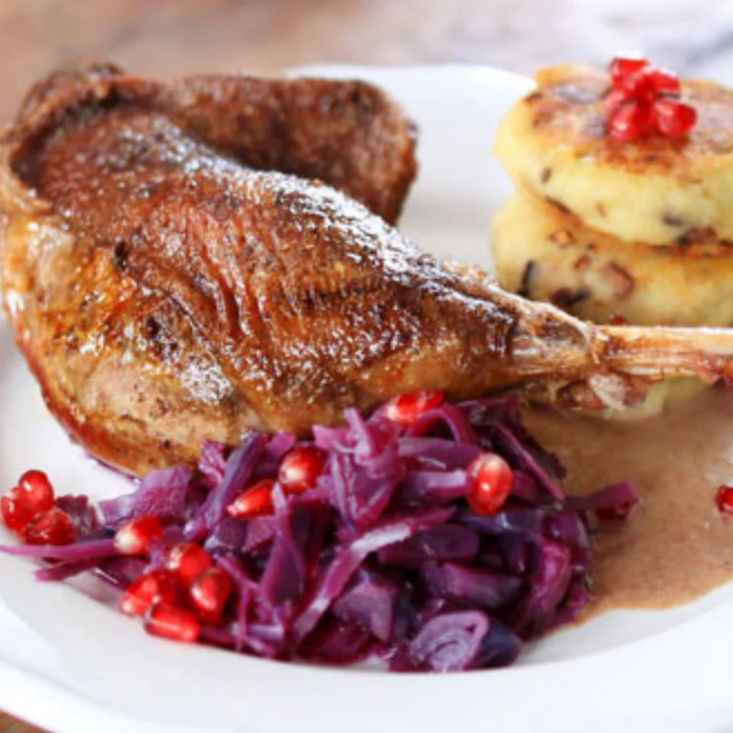 Rezepttipp: Knusprige Gänsekeule mit Granatapfel-Rotkohl