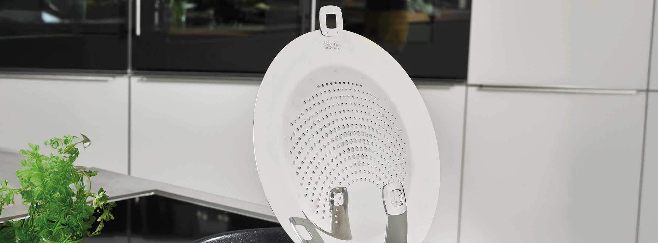 Bei der Zubereitung von Zutaten, die wie Gemüse einen hohen Wasseranteil oder wie saftiges Fleisch einen höheren Fettanteil haben, können Fettspritzer entstehen. Ein Fissler Spritzschutz für Pfannen schützt dich und sorgt für ein sicheres Kocherlebnis.