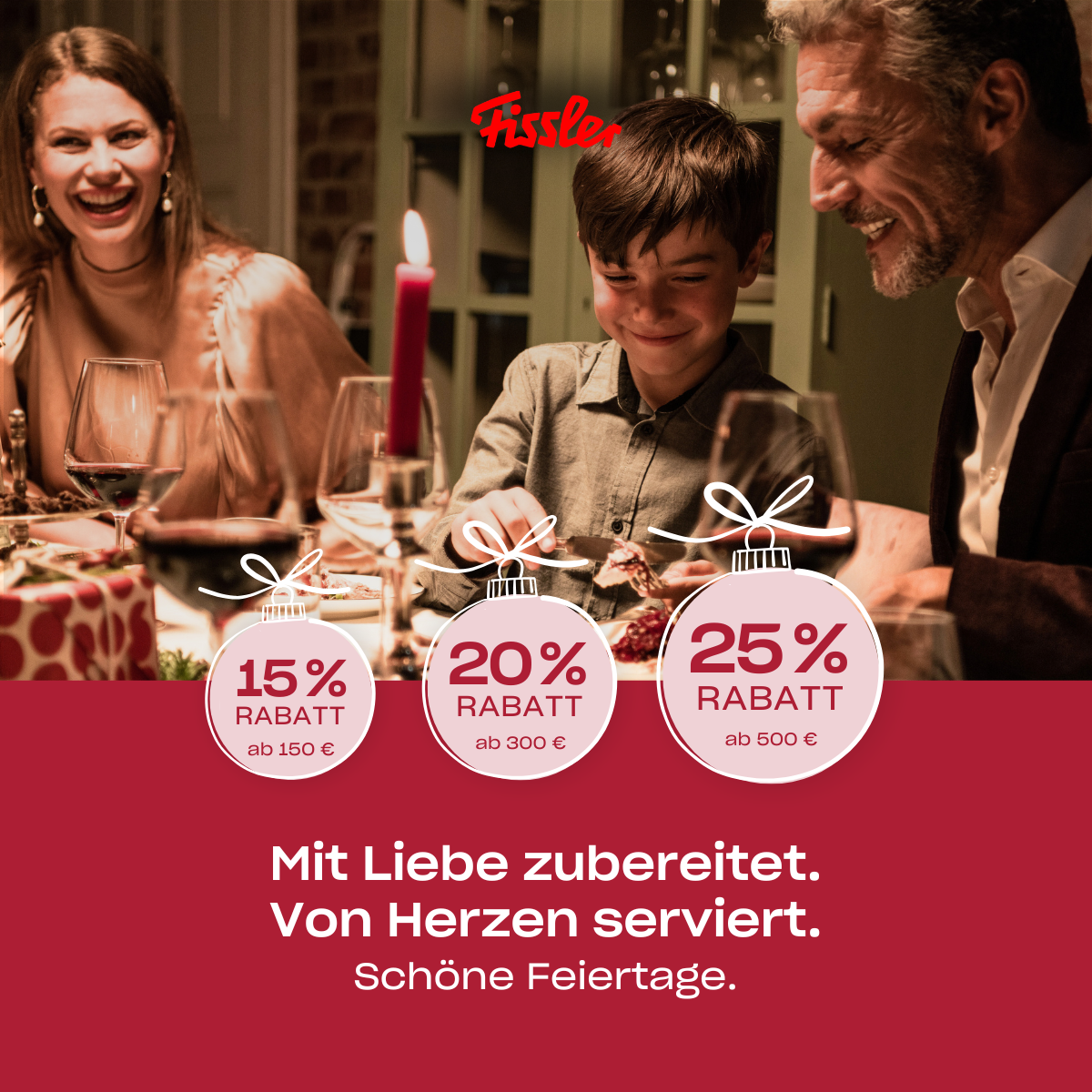 *Gültig auf fissler.com bis einschließlich 02.01.2026; Nicht kombinierbar mit anderen Aktionen; Ausgeschlossen sind reduzierte Produkte.