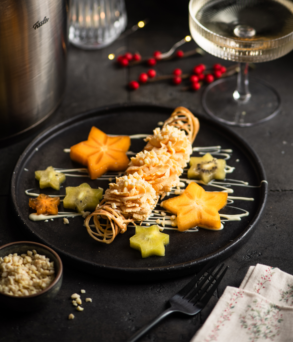 Dieses Menü bringt kräftige Winteraromen auf den Tisch: Belugalinsen und Granatapfel im Vorspeisensalat, ein fein abgestimmtes Rehragout im Hauptgang und Rotweinbirnen als eleganter Abschluss. Perfekt für alle, die zu den Feiertagen etwas Besonderes servieren möchten.