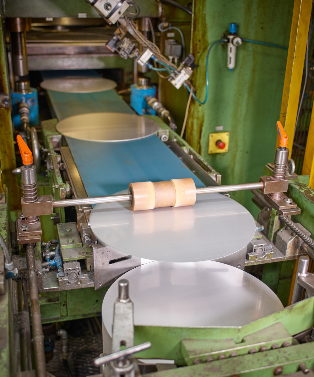 Unsere Adamant® Pfanne beginnt als Aluminium-Ronde, die wir von einem deutschen Premiumhersteller beziehen. Nach Eintreffen der Ronde und Qualitätsüberprüfung wird es laut in unserer Produktionshalle: Auf einer Schlagpresse wird ein Induktionsboden auf die Aluminium-Ronde untrennbar aufgeschlagen.