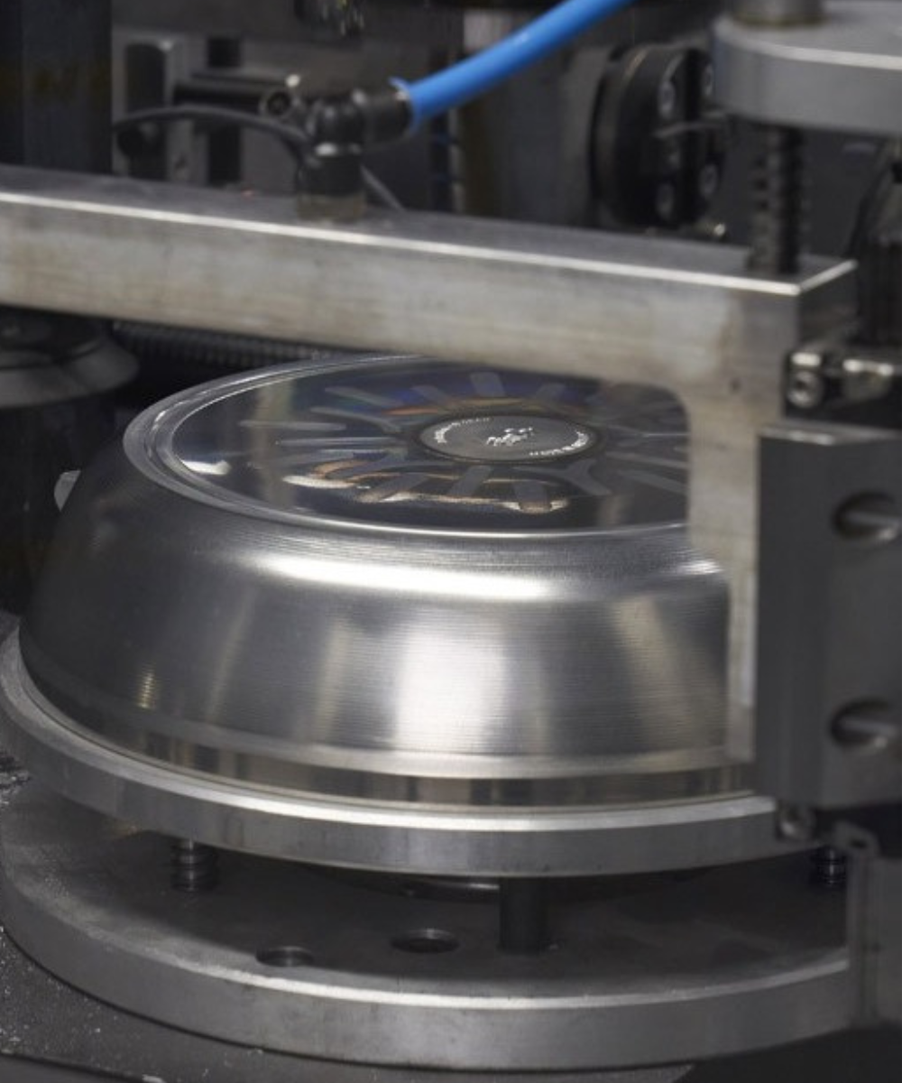 Wie die Form deiner Pfanne entsteht? Die Ronde wird über einen Ziehkörper in Pfannenform gedreht. Diesen Vorgang nennt man auch Planieren. Anschließend wird das überflüssige Material entfernt und zu einem glatten Rand abgedreht. Bei einer intensiven Reinigung werden sämtliche Fettrückstande vom Umformen entfernt.