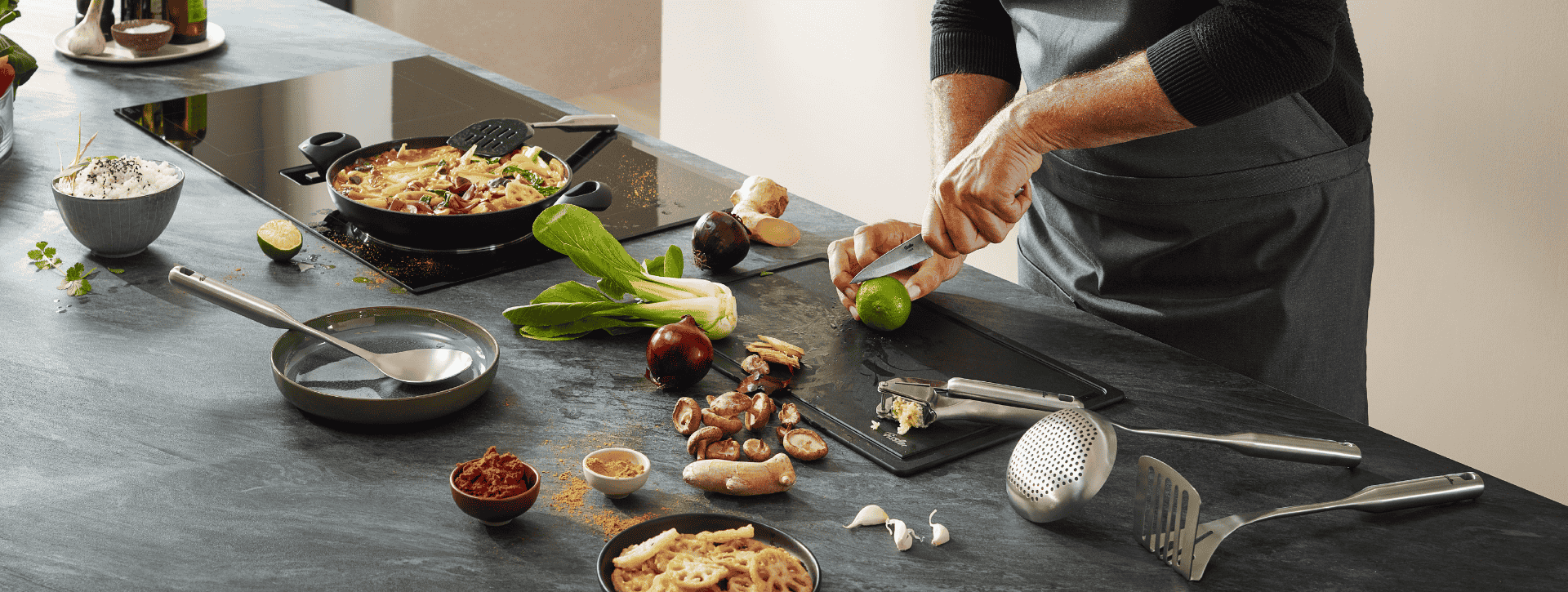 Ob beim Hacken von Gemüse, Braten eines saftigen Steaks oder kunstvollen Anrichten – mit Fissler Essential® ist man bestens für das tägliche Kochen ausgestattet.