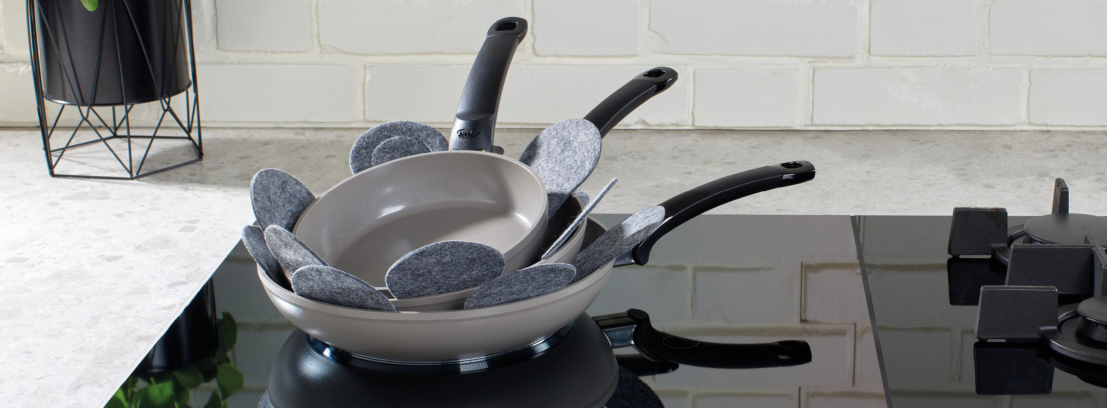 Damit dabei die Antihaftbeschichtung bei beschichteten Pfannen nicht zerkratzt, gibt es Pfannenschoner, die deine Pfannen schützen.