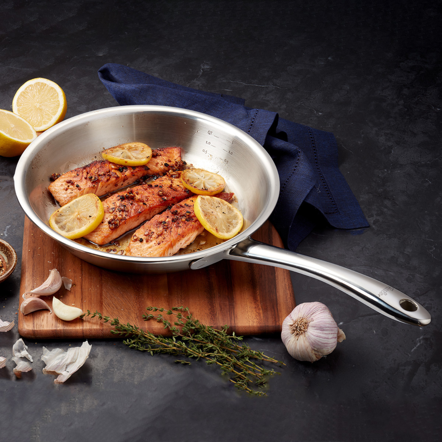 Engineered for exceptional performance, our cookware features a sophisticated 5-layer construction of premium recycled stainless steel and aluminum that heats quickly and offers precise heat control.